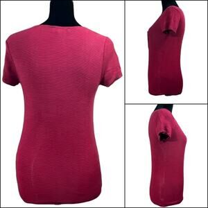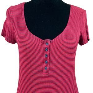 Women's henley style t-shirt from Forever 21 in red with black stripes. Short sleeves, with buttons down the front, ribbed fabric. Size Medium. 97% Rayon 3% Spandex. Due to light & screen variations, colors may vary slightly from the images