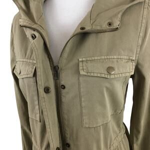 Forever 21 Hoodie Utility Jacket. Size small. Light olive green. Zipper front with hidden snaps. Front upper & lower snap pockets. Long sleeves with snap cuffs. Adjustable waist. Excellent used condition (100% cotton).