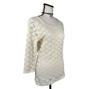 Forever 21 ivory knit tunic with an allover diamond lace pattern and subtle shimmer. Features a scoop neckline, 3/4 sleeves and a slim, slightly longline silhouette that can be styled as a top or a short dress. Stretchy fabric blend for comfort and shape retention. Made in the USA— early 2000s/Y2K era Forever 21.