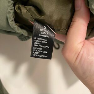 100% cotton. Zip up and snap closure. Missing one snap button on pocket as pictured. Stay stylish and comfortable with this olive green hooded jacket. Perfect for any casual outing.