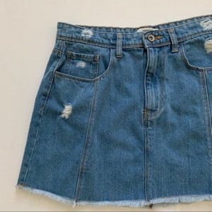 Forever 21 Light Wash Distressed Seamed Front Raw Hem Denim Jean Mini Skirt