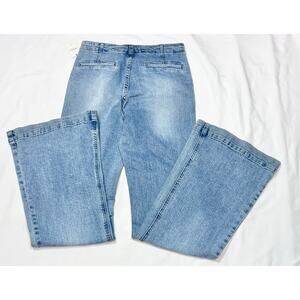 Introducing Forever 21 Jean Pants in women's size 27W x 31L, featuring a washed blue denim finish with a flared leg design. Made from a cotton blend for comfort and everyday wear. These jeans are pre-owned and show light signs of use, with some minor stains as shown in pictures.