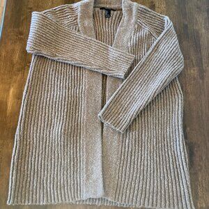 This is a very nice Forever 21 open front cardigan sweater for women in size large. It's a neutral light coffee brown color with cream colored specks throughout. It is a longer tunic length and has hidden pockets to keep your hands warm. I removed the fiber content tag but I would guess it's an acrylic/polyester/cotton blend. This is a very soft (not itchy) heavier weight chunky cardigan in excellent, like new condition from my own wardrobe.