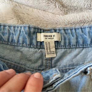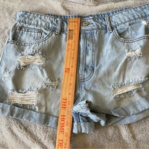 Stylish light blue jean shorts with ripped details. Ideal for casual wear.