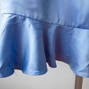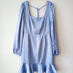 Satin mini dress in a soft light blue color. Features a square neckline, long sleeves with elastic cuffs, and a ruffle hem. Size Small.