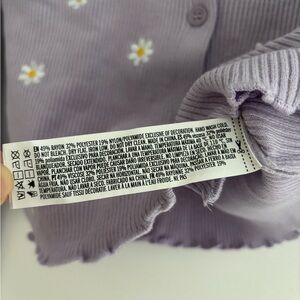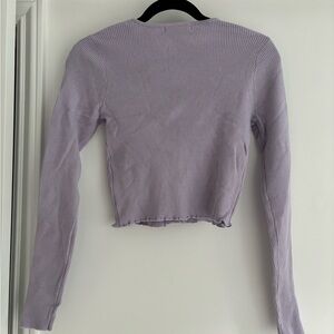 Soft ribbed knit cardigan in light lavender. Front button closure. Simple, feminine silhouette.
