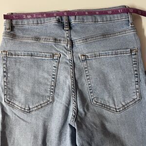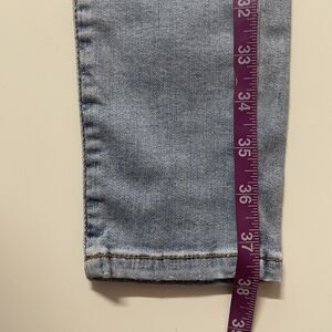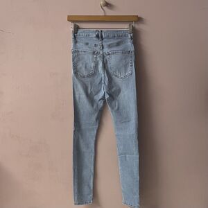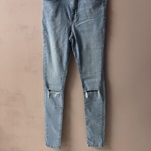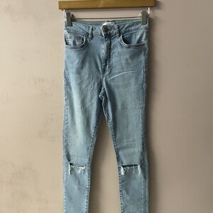Classic light blue high waisted skinny jeans with a slit in the knees. Perfect for a casual grungy outfit with an oversized tee and a flannel or shacket or a chunky cardigan and some hi-top sneakers like Chucks or Sk8 His. In excellent condition. May be smaller than size 27, so please refer to approximate measurements shown in photos. Feel free to ask questions or make an offer!
