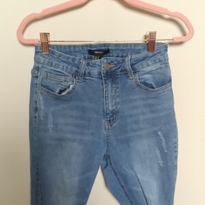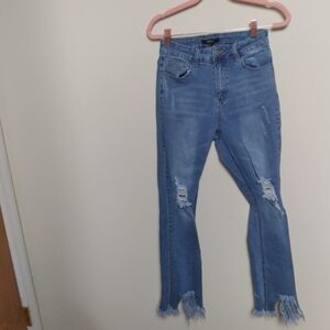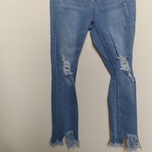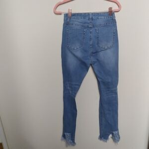 Forever 21 light wash high rise distressed five pocket stretch denim jeans with destroyed frayed hems