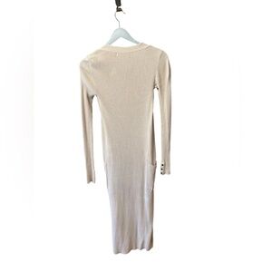 Longline beige ribbed cardigan with snap-front closure. Soft, lightweight knit with stretch. Great for layering. Excellent condition, no noted flaws.