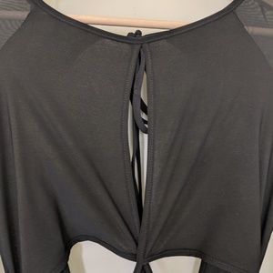 A stretch knit maxi dress featuring sheer long sleeves, cutouts in front, and an open back secured by a self-tie neck closure.