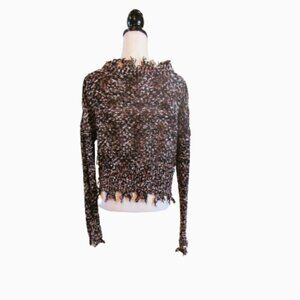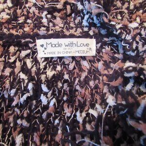 Very unique sweater with tan, black and a touch of peach yarn. It has ragged sleeve edges and around the collar. It is a size medium. Made with Love - Forever 21 Material: 52% acrylic - 48 % polester Size: Length: 20 inches Armpit to armpit lying flat : 21 inches Sleeve Length: 28 1/2 inches from upper shoulder edge Care: Machine wash, cold water, gentle cycle Previously loved, in excellent condition. Thank you for stopping by my closet… all offers. b16