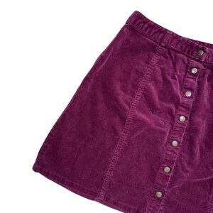 Forever 21 •Burgundy, Maroon •A-Line •Metal Button Front •Mini Skirt •Pairs well with Tights •Valentines Day •Date Night •casual •Corduroy •Materials Tag Missing •Equivalent to a Women’s Small / Size 4