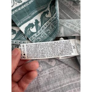 Men’s Forever 21 short sleeve button-up shirt in green and white with a stylized wave/scroll stripe print. Lightweight, 100% cotton. One chest pocket. Good pre-owned condition with light overall wear, no holes or stains noticed.