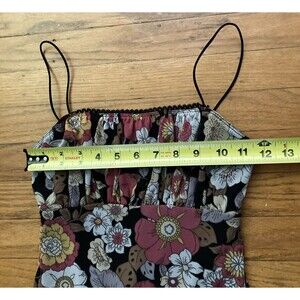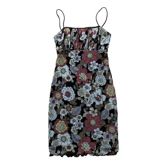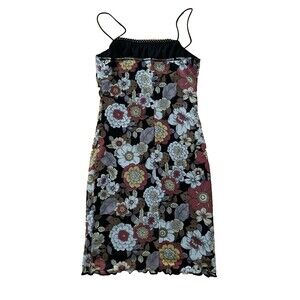 The cutest little slip dress from Forever 21. Bold floral design on sheer mesh fabric, fully lined, empire waist, and lettuce hem. Not vintage, but very retro Y2K styling. Great pre-owned condition - no flaws or stains. See photos for details. Material and care tag has been removed, as well as hanger straps.