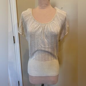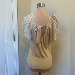 Forever 21 metallic knit top, Forever 21 shimmer blouse, women’s medium open back shirt, short flutter sleeve metallic sweater top, Forever 21 date night top, casual night out knit blouse, holiday party shimmer top, versatile work to evening top, Forever 21 USA made shirt, brunch outfit shimmer blouse, back tie open back shirt, feminine metallic knit top, women’s occasion knit top, Forever 21 neutral shimmer blouse, trendy metallic going out top