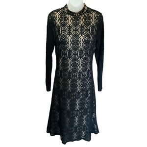 Midi Dress by Forever 21 knee-length dress in classic black lace overlay with tan lining, high neck with sheer lace long sleeves zipper back