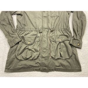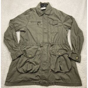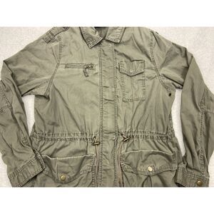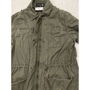 Forever 21 Military Jacket Womens LARGE Olive Green Army Chore Pockets Cinch Waist Roll Tab Sleeve Vented Under Arms ***Pre-Owned Clothing sometimes shrinks after being washed - Please See Measurements in Photos to ensured desired fit***