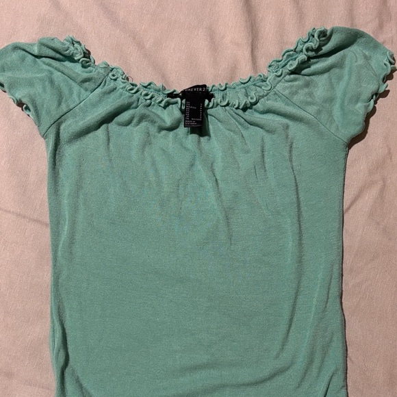Elegant mint green blouse with ruffled neckline. Ideal for casual or dressy occasions.