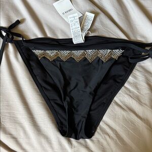 Detail silver and gold side tie bikini bottoms. Pool party impress.