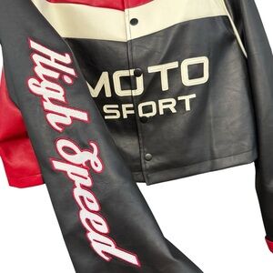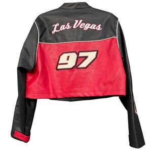 Edgy and bold! This Forever 21+ moto racing jacket is a head-turning piece with black, red, and cream color blocking, snap button front, and standout embroidered details. Features “Moto Sport” front graphic, checkered racing flags, “Las Vegas 97” on back, “High Speed” down the arm, and Moto Sport sleeve patch.