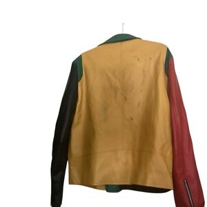 Bold faux leather jacket with red, green, black, and gold panels. Eye-catching design for a trendy look. Never been worn. Has green discoloration on back. See picks.