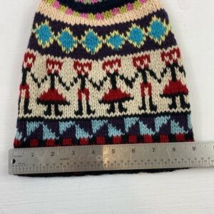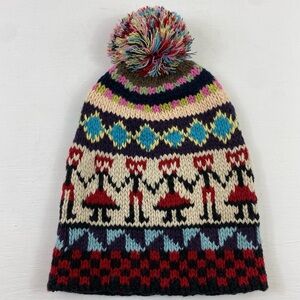 Chic knit beanie with a fun pom-pom and multicolor graphic people design. Very good preowned condition. No holes or stains. Color may vary slightly due to lighting. Please review photos closely for verification of condition and measurements. Please ask any questions before purchasing. Comes from a smoke free, pet free / but pet friendly home. If you have allergies, please ask.