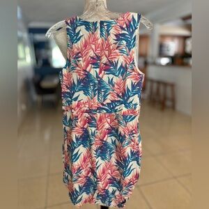 Sleeveless dress with vibrant leaf design. Features shades of pink and blue on a cream base. Ideal for casual wear.