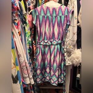 Vibrant dress with ruffle details. Features a multicolor pattern. Perfect for a bold look.