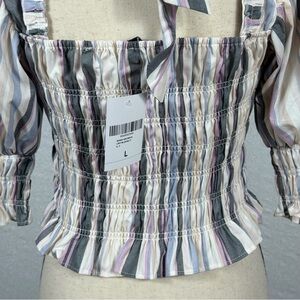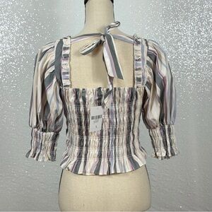 Stylish blouse with multicolor stripes and ruffle details. Tie Bow in the back.Features a smocked waist and puff sleeves.New with tags.