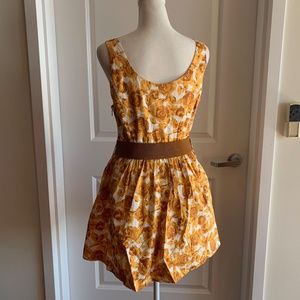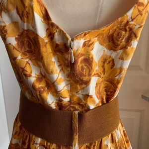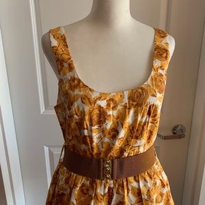Forever TWENTY ONE NWT Sleeveless Mini Floral Flare Belted Dress Cream, Brown, Mustard Gold Medium 100% cotton lining, Side zipper, Belt with goldstone accent clasp closure Business Casual Contemporary Coastal Beach Vacation Travel