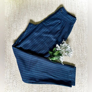 Forever 21 navy and green check plaid trouser pants in woven fabric. Zipper and button closure, front and back pockets, pleated front.