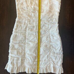 This NWT women's white Forever 21 strapless mini dress in size S is perfect for a night out or a casual occasion. The sleeveless and solid pattern make it versatile for different styles, with the short length adding a stylish touch. The dress is designed for juniors and would be a great addition to any woman's wardrobe looking for a fashionable and on-trend option.
