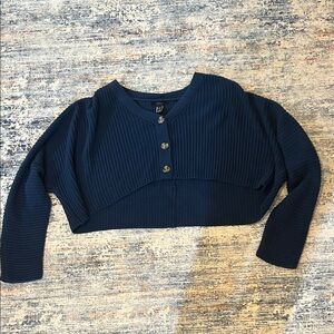 Stylish navy blue cropped cardigan. Features ribbed texture and button-up front. Perfect for layering.