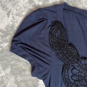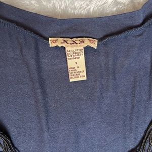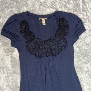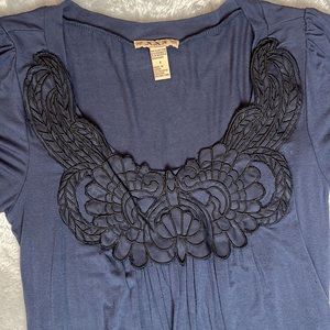 Forever 21 navy blue dress. Size S. Embroidered bib front. Short sleeves with slight ruching at shoulder. Stretchy dress. Measurements taken laying flat: 15.5” armpit to armpit. 34” from shoulder to hem.
