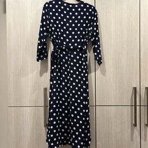Adorable and flattering wrap midi dress by Forever 21. Navy blue with classic white polka dots. Features a tie waist for an adjustable, flexible fit, 3/4 length sleeves, and a feminine tulip hemline. Size Large. Like new condition — see photos for measurements.