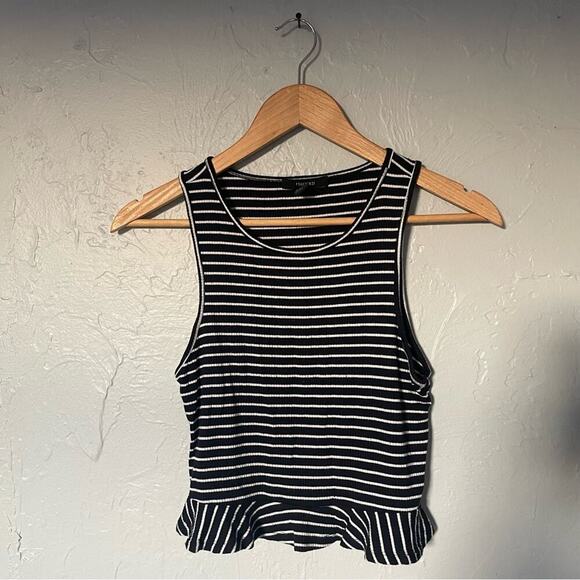 Discover the elegance of the Forever 21 tank top, showcasing a striking black and white stripe design. This sleeveless crop top features a flattering peplum flare, adding a feminine touch to its fitted silhouette. Perfect for any occasion, it combines style and comfort effortlessly.