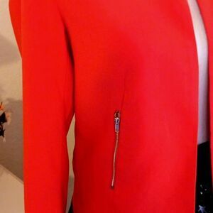 Bright orange open blazer. Satiny full lining. Two exposed zip pockets on front. Washable. Size M measures 41 at chest, 20 at bottom hem. 23 long from slightly padded shoulder to hem, sleeves 24. A stunning statement.