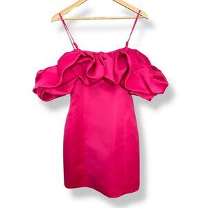 Forever 21 bombshell pink mini dress with exaggerated puffed ruffle off-the-shoulder style. Adjustable spaghetti straps. Hidden zipper in back. Makes a great Barbie Halloween costume!
