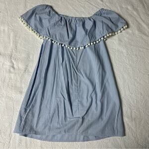 Super cute off the shoulder dress. Blue and white vertical stripes. With pol pol detailing. Size large