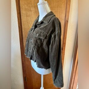 Stylish olive corduroy jacket with button front. Features classic collar and chest pockets. Perfect for casual wear.