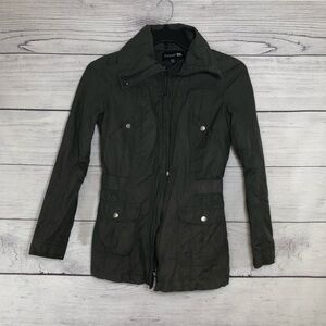 Olive utility jacket with several pockets, zipper enclosure, and cinched waist.
