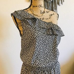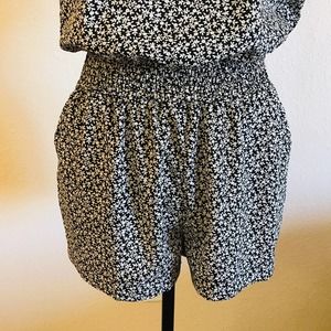 Cute and lightweight floral romper with ruffle trim. Has pockets! Elastic waist. Measured 30” from shoulder to hem. 15” armpit to armpit. 100% polyester.