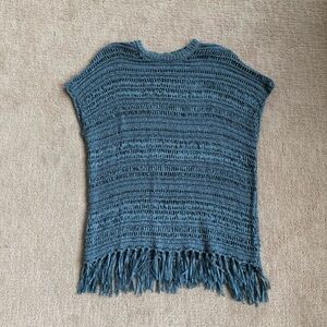 Stylish teal knit poncho with fringe detail. Perfect for layering. Can also be used as a coverup.
