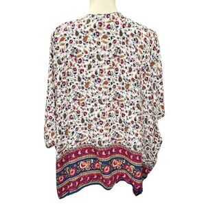 Lightweight and flowy, this Forever 21 open-front kimono features a colorful paisley print with a bold border along the hem. Drapes beautifully for effortless boho styling β perfect for festivals, beach days, or layering in warm weather.