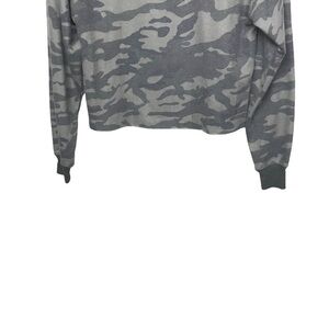 Pale green and grey, camouflage print sweater with raw hem. Preowned but in good condition.