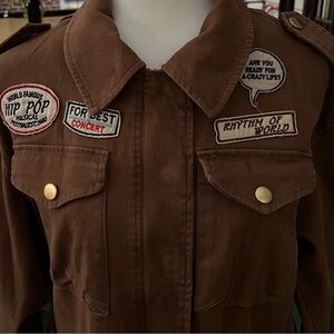 Vintage Forever 21 collared utility jacket with patches, including "World-Famous Hip Pop Musical Festival Est. 1980," "For Best Concert," "Are You Ready For a Crazy Life?" and "Rhythm of World" in brown.
