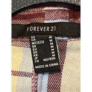 This Forever 21 shirt features a distinctive patchwork plaid design, blending burgundy and blue hues. Its cropped silhouette and button-down style provide a modern twist on a classic look. Ideal for casual or semi-casual settings, this garment seamlessly integrates comfort with style, making it a versatile wardrobe addition.