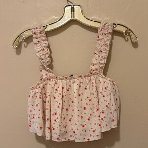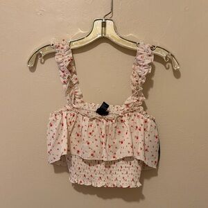Charming tank top with floral print. Features ruffle straps and smocked design. Ideal for casual wear.