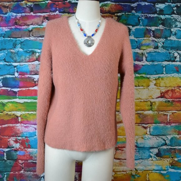 Forever 21 Pink Mauve Fuzzy V Neck Long Sleeve Ribbed Sweater Size M