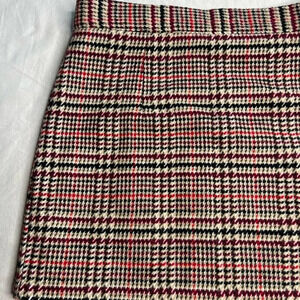 Chic mini skirt with a classic plaid houndstooth design. Features a full front zipper closure for a modern twist and a comfortable fit. Crafted from a blend of polyester, acrylic, rayon, and wool, this multicolor skirt is perfect for adding a touch of sophistication to any outfit. Ideal for casual outings or a night out, this versatile piece is a must-have for your wardrobe. Size 29. Dry clean only.